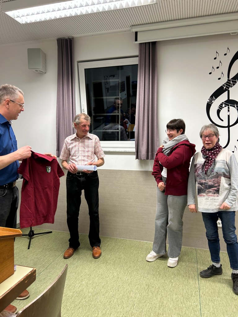 Ein emotionaler Moment für alle auf der Hauptversammlung war die Übergabe der Spende aus unserem Benefizkonzert am 21.Dezember 2025 an Anja Traub und ihre Familie. Anja spielte Querflöte in unserem Verein und war in der Vorstandschaft als Beisitzerin tätig, wo sie die Öffentlichkeitsarbeit übernahm. Aufgrund eines Schicksalsschlags ist ihr das nicht mehr möglich. Deshalb war es uns eine Herzensangelegenheit sie und ihre Familie so gut es geht zu unterstützen. Im vergangenen Jahr besuchten wir Anja bereits in der Rehaklinik in Gailingen. Ein geplantes Konzert dort musste wetterbedingt leider abgesagt werden. Wir freuen uns, dass wir Anja und ihre Familie nun mit 2.700€ unterstützen können. Außerdem haben wir, passend zur neuen Uniform, neue Tshirts und Sweatjacken bestellt. Auch dies haben wir Anja übergeben. Die Freude auf allen Seiten war jedem anzumerken und es wurde auch die ein oder andere Träne verdrückt.