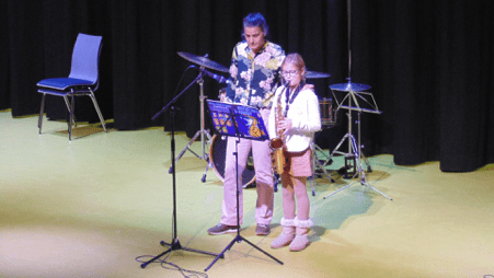 Sie spielten ebenfalls mit ihrer Klarinette ,,Melodie für Sophia” und ,,alter Tanz” vor. Sie sind dabei unter der Leitung von Janina Kleck.