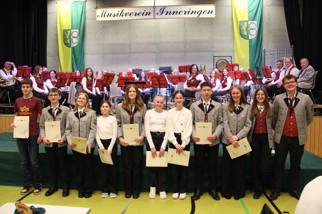 Ausgezeichnet für ihre tollen Leistungen bei der D1 Prüfung im vergangenen Jahr wurden Leonie Schönle, Karina Grom, Emilia Pick, Rosa Schüle, Sophia Pflug, Tobias Maier, Jonas Nothhelfer, Nele Brandstetter und Jan Bohner. Für 10, 40 und 60 Jahre aktive Mitgliedschaft wurden Sophie Blatter, Thomas Metzger, Martin Maier und Franz Reisacher geehrt. Für und mit den Geehrten wurde der Marsch „Ein Stück Ewigkeit“ gespielt.