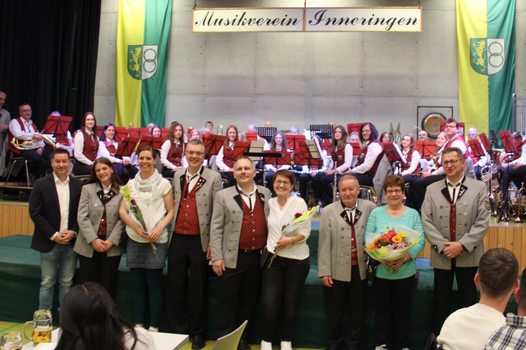 Nach einer kurzen Umbauphase nahm der Musikverein mit ihrem Dirigenten Michael Muntowitz auf der Bühne Platz. Den Einstieg in das Programm stellte der Marsch „Kameraden auf See“ dar. Nach dem Medley des Komponisten Ennio Morricone „Moment for Morricone“ und dem Stück „Ich gehör nur mir“ aus dem Musical „Elisabeth“ folgte das Stück „Backdraft“ aus dem gleichnamigen Film, welches den Zuschauern musikalisch die Gefahr einer Rauchgasexplosion und den Mut der Feuerwehrleute aufzeigte. Aus diesem Grund widmete Mona Reuthebuch, die gemeinsam mit Sophie Blatter durch das Programm führte, dieses Lied der freiwilligen Feuerwehr Inneringen. Nach „La Brass Polka“ fanden die Ehrungen statt.