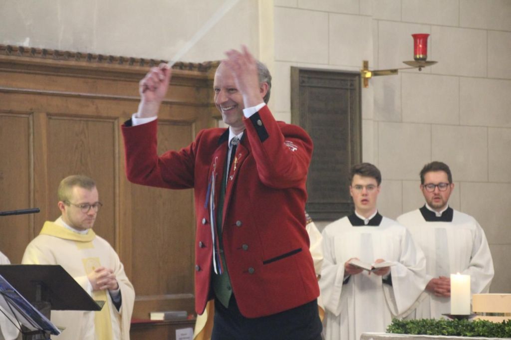 Zum Abschluss des feierlichen Gottesdienstes spielten beide Kapellen gemeinsam das Stück „Canto Ambriosano“ unter der Leitung des Dirigenten des MK Feldhausen-Harthausen Dietmar Pelz. Dieses Stück hat die Besonderheit und Herausforderung, dass es gemeinsam mit der Orgel gespielt wird und innerhalb des Stückes, mit „Großer Gott“, die Gemeinde singend einsetzt.
