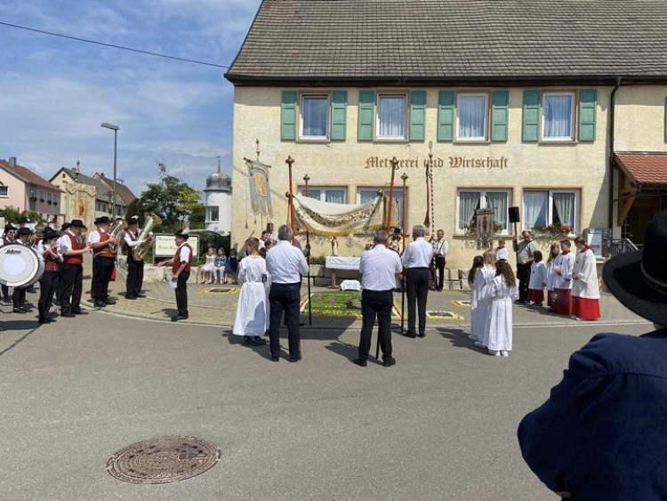An Fronleichnam durften wir die Prozession durch das Ort musikalisch begleiten. Im Anschluss an den Gottesdienst um 10 Uhr zogen wir durch das Ort und zurück zur Kirche. Insgesamt drei Blumenteppiche konnten bei der Prozession bewundert werden.