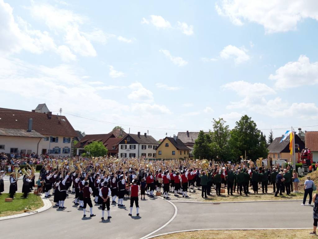 Gemeinsam mit 27 weiteren Musikvereinen spielten wir bei strahlendem Sonnenschein um 14 Uhr gemeinsam die Stücke „Hoch Badnerland“, „Wir Musikanten“, „Highland Cathedral“ und „Deutschlandlied“.